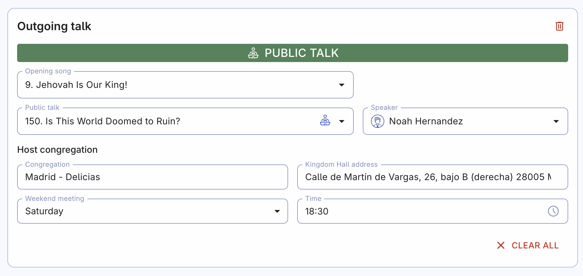 You can also include outgoing talks in the schedule — these are talks given by your congregation's speakers at other congregations. To do this, click the 'Add outgoing talk' button under the main meeting scheduling card and enter the details, such as the title, songs, speaker's name, and host congregation. Scheduling these talks in the Organized app helps keep everything in one place, making sure speakers are well-prepared. It also helps with communication between congregations since outgoing talks are synced if they're both using Organized, ensuring speakers know about their assignments ahead of time.