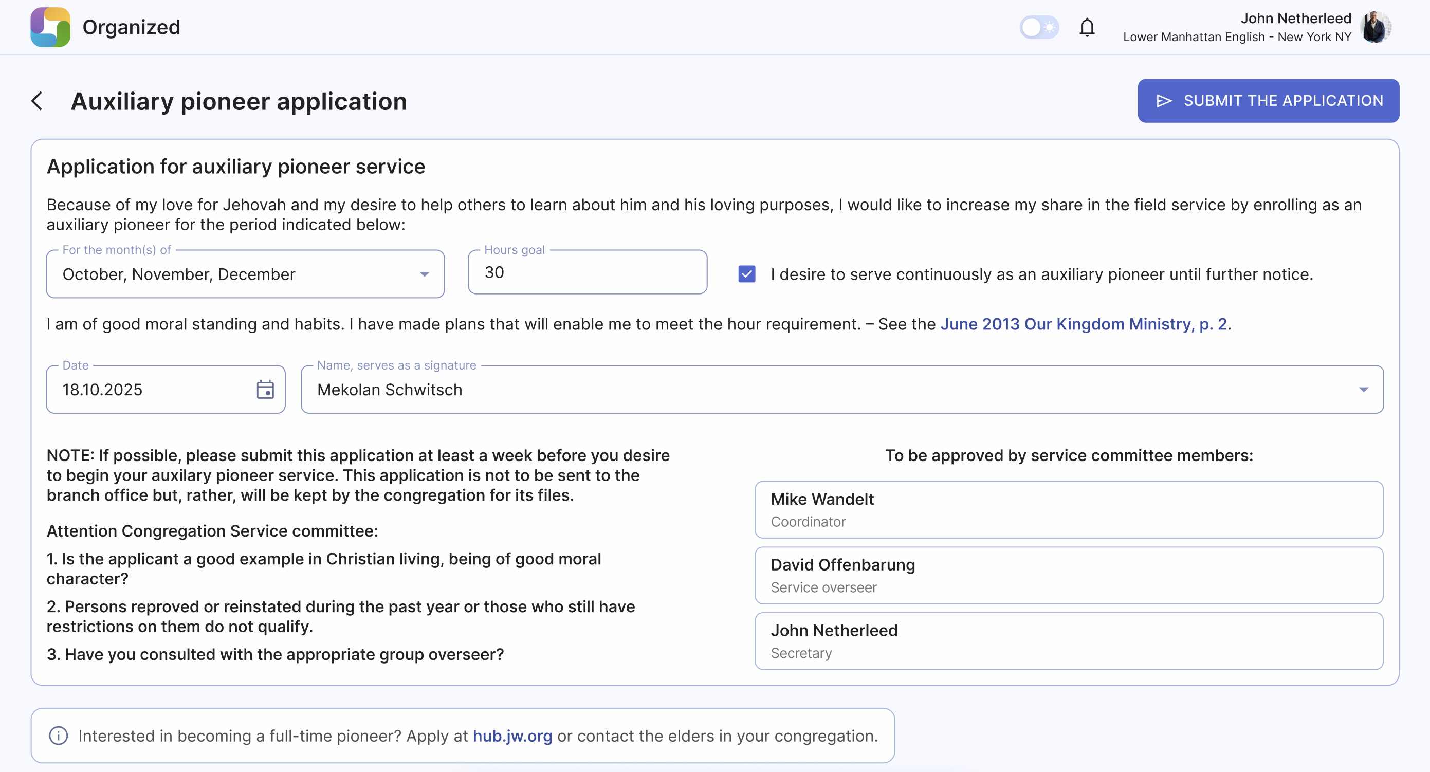 You can submit an auxiliary pioneer application right in the Organized app and your elders will review it. To do this, click the 'Auxiliary pioneer application' button located at 'Ministry' card on the home page.